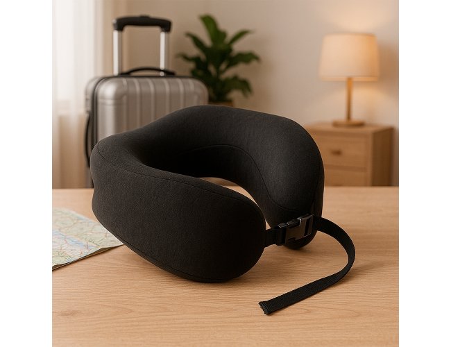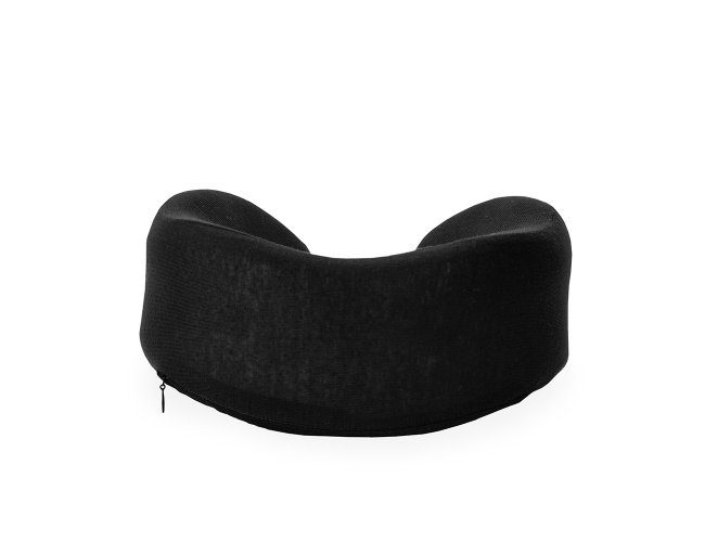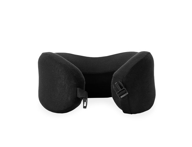 Almofada de pescoço com design anatômico, enchimento em espuma viscoelástica macia em poliuretano e capa em poliéster. Possui alças ajustáveis em nylon e fechamento com engate plástico.