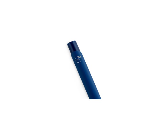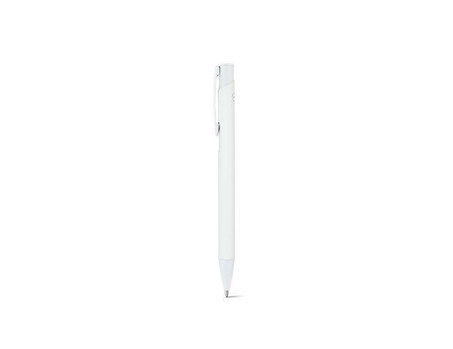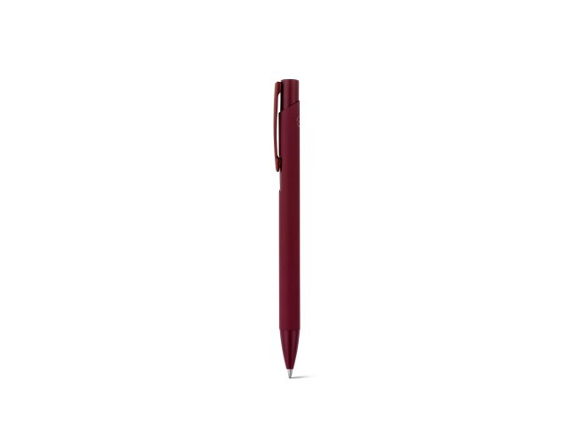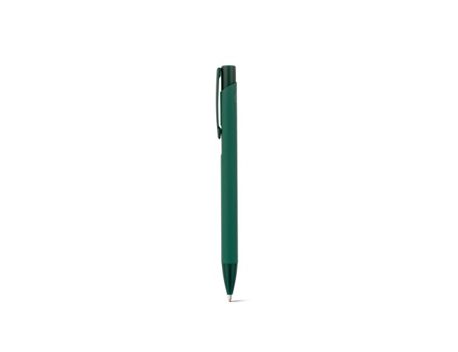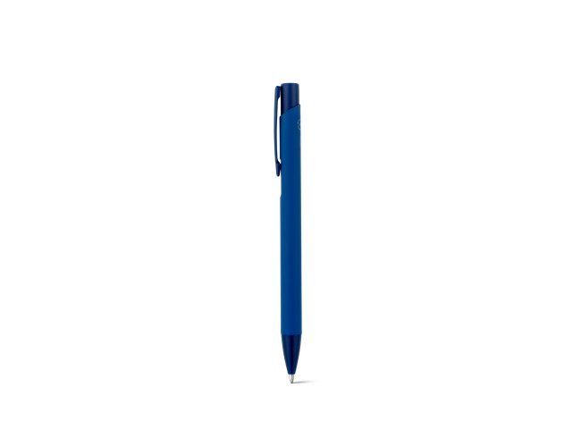 Esferográfica em alumínio 100% reciclado, com acabamento em borracha. Escrita em azul até 1,5 km. Tam: ø10 x 136 mm.