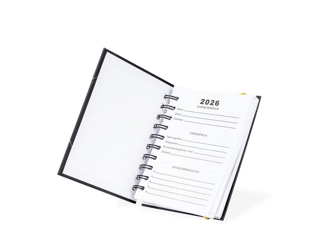 Agenda diária 2026 com capa dura, elástico de fechamento, marca-páginas de fita de cetim e encadernação Wire-O. Conta ainda com páginas dedicadas a dados pessoais, calendários de 2026 até 2028, além de listas de metas, planejamento mensal e contatos.