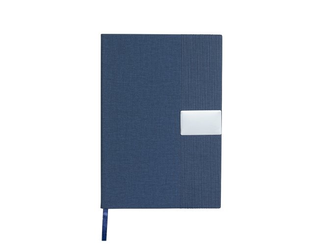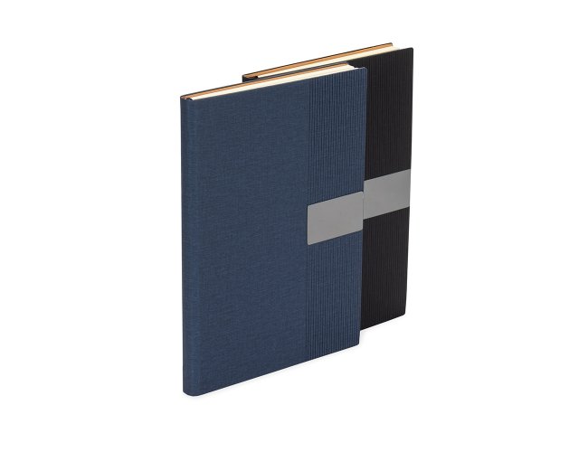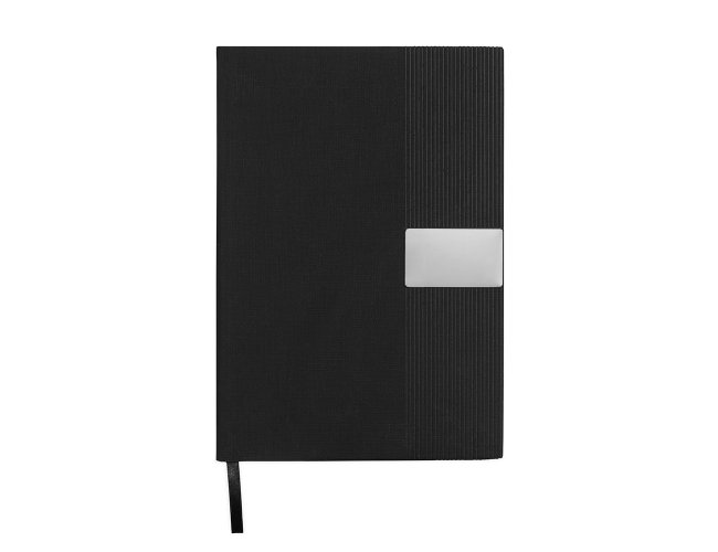 Caderneta de capa em couro sintético com detalhes texturizados, plaquinha metálica personalizável, marca-páginas em fita de cetim e aproximadamente 96 folhas marfim pautadas.