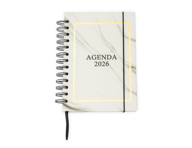 Agenda diária em capa dura, encadernação Wire-O, elástico de fechamento e marca-páginas em cetim. Contém ainda páginas dedicadas a dados pessoais, calendários de 2026 a 2028, planejamento mensal e lista de contatos.
