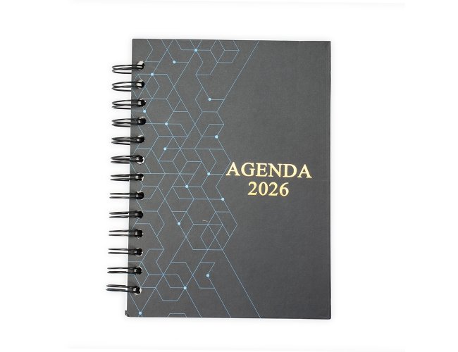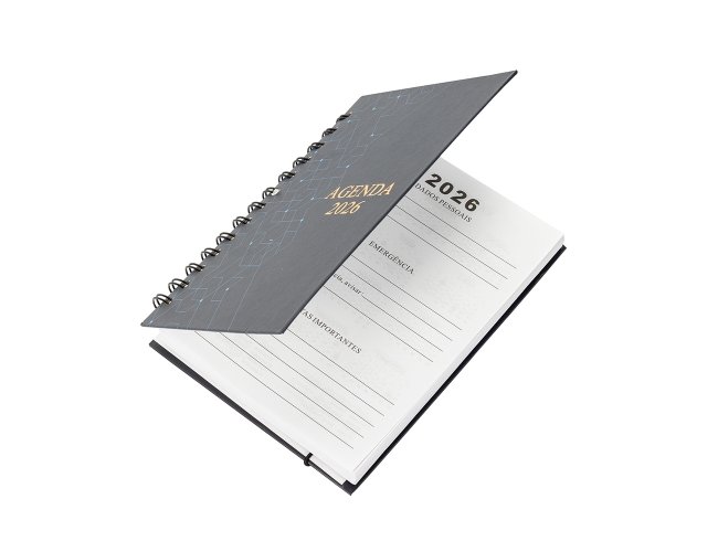 Agenda diária em capa dura, encadernação Wire-O, elástico de fechamento e marca-páginas em cetim. Contém ainda páginas dedicadas a dados pessoais, calendários de 2026 a 2028, planejamento mensal e lista de contatos.