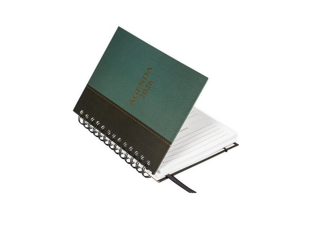 Agenda diária com capa dura, encadernação Wire-O, marca-páginas em cetim e elástico para fechamento. Contém ainda páginas dedicadas a dados pessoais, calendários de 2026 a 2028, planejamento mensal e lista de contatos.