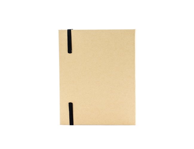 Bloco de anotações com capa dura em kraft e fechamento por elástico. Possui aproximadamente 80 folhas de tonalidade marfim sem pautas e cinco canetas coloridas de ponta dupla: uma fina e outra tipo pincel.