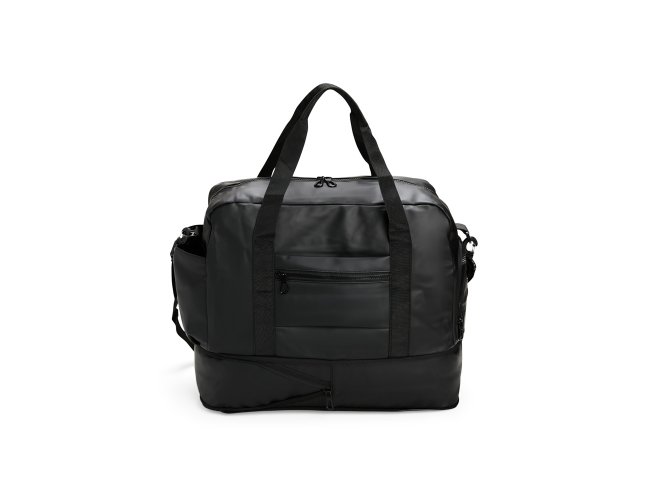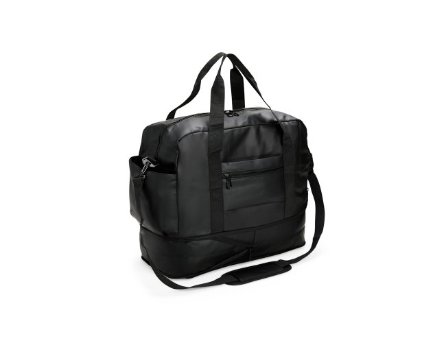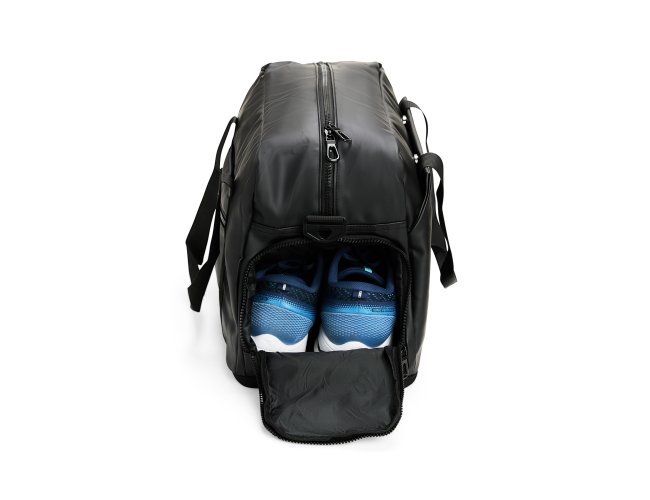 Bolsa em filme sintético tipo couro impermeável, com até 30 litros de capacidade após expansão inferior. Possui compartimento interno com bolso menor e outros quatro externos: um com botão magnético, um para calçados, um aberto e outro com zíper e encaixe para malas. Possui um par de alças laterais de mão e uma alça transversal removível.
