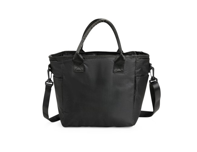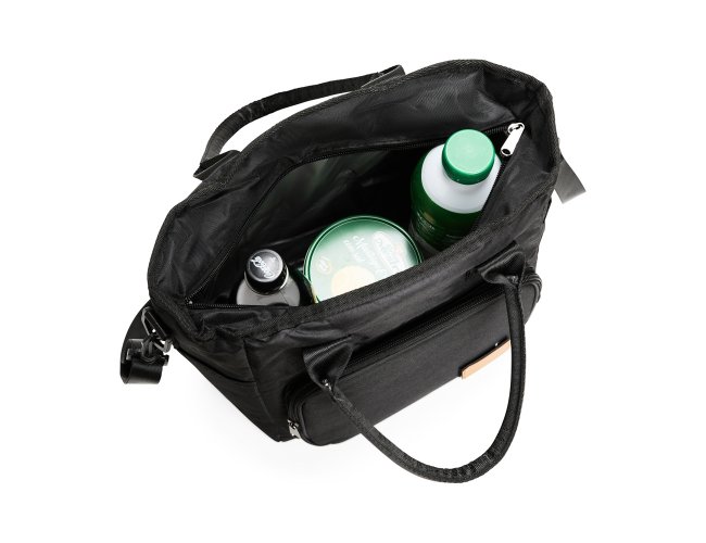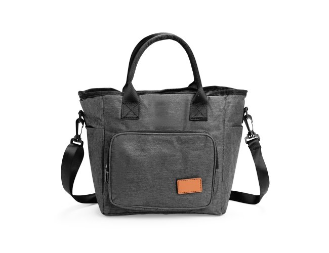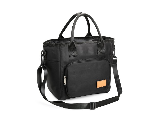 Bolsa térmica com capacidade de até 10 litros. Confeccionada em Oxford resistente à água, possui compartimento interno com revestimento térmico em PEVA e fechamento em zíper. Conta ainda com bolso frontal com plaquinha de couro sintético fixada com velcro, um par de bolsos laterais e duas alças fixas para transporte, além de uma alça transversal regulável com mosquetões para encaixe nas fivelas laterais da bolsa.