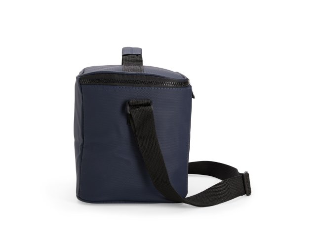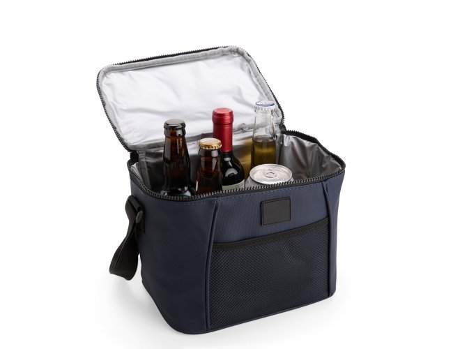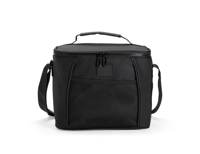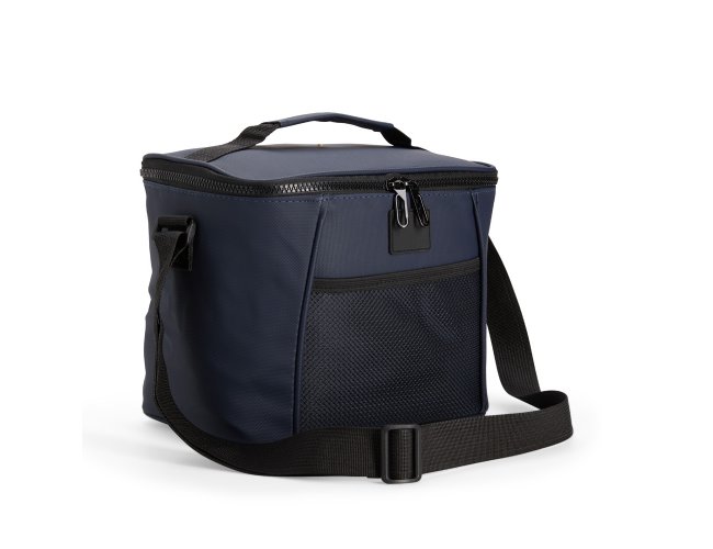 Bolsa térmica confeccionada em poliéster mesclado com PVC impermeável, fechamento em zíper e capacidade máxima de 7 litros. Conta com revestimento térmico em PEVA atóxico, o que oferece maior tempo para a conservação da temperatura de alimentos e bebidas. Apresenta placa emborrachada para personalização, dois bolsos abertos em tela de nylon com elástico, além de alça de mão e alça transversal.