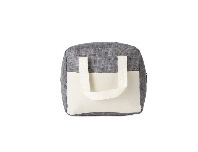 Bolsa térmica confeccionada em poliéster, com fechamento em zíper e capacidade máxima de 8 litros. Possui revestimento térmico em folha de alumínio, além de bolso frontal aberto e alças de mão em poliéster mesclado com algodão.