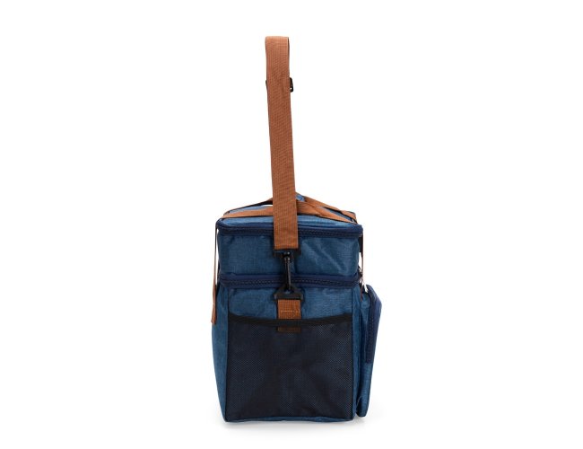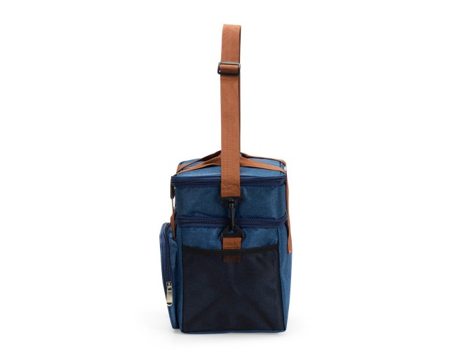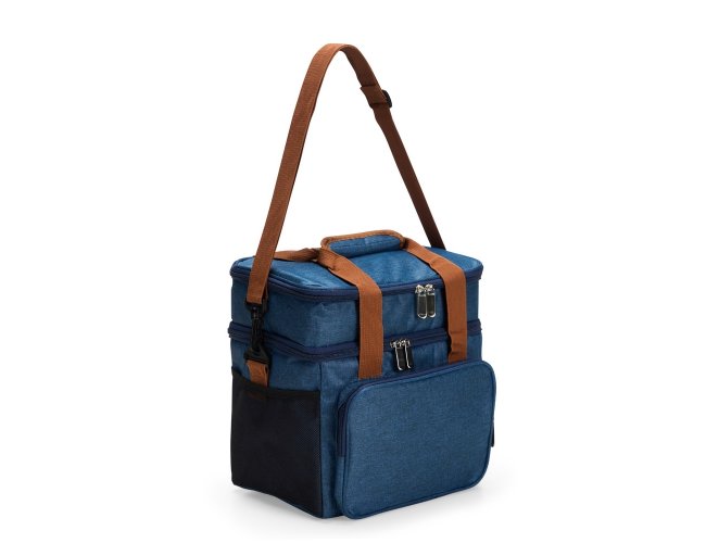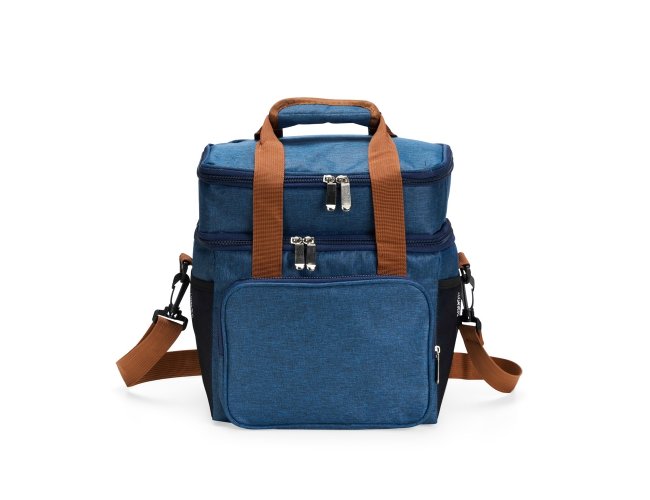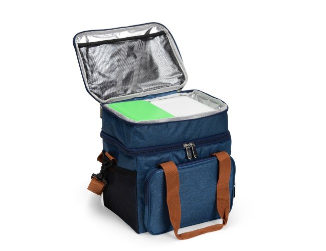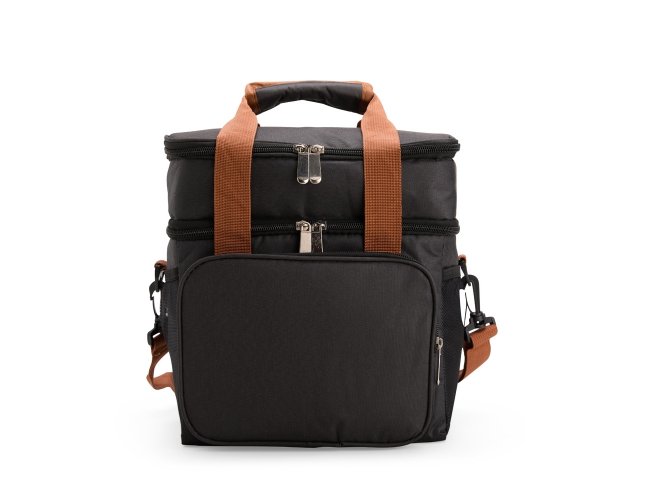 Bolsa térmica dupla em poliéster 300D resistente à água e capacidade total de 12 litros. Possui dois compartimentos térmicos: um inferior, com revestimento em PEVA soldado (não vaza) que comporta até 9 litros e outro, em alumínio, com espaço para até 3 litros.. Conta ainda com bolso frontal, bolsos laterais em tela, alças de mão com suporte de juntura e alça transversal regulável e removível.