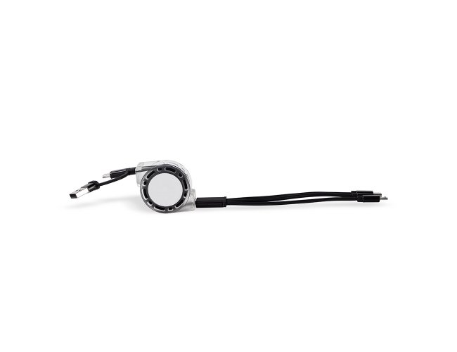 Cabo USB retrátil com níveis ajustáveis e extensão de até 1,05 m. Apresenta três cabos com saídas USB-C, Micro USB e Lightning em uma das pontas, enquanto a outra conta com entrada USB-C e adaptador USB tipo A. Obs.: A transferência de arquivos e dados em dispositivos Android funciona apenas pela saída USB-C.