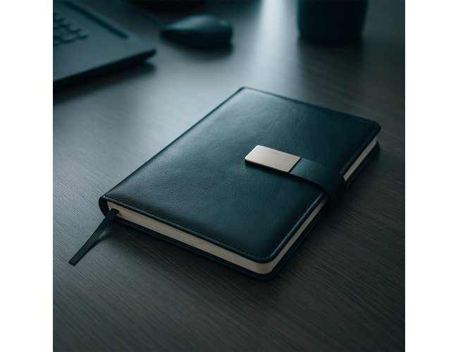 Caderneta com capa em couro sintético, aba para fechamento com plaquinha metálica personalizável, marca-páginas em fita de cetim e aproximadamente 96 folhas marfim pautadas.