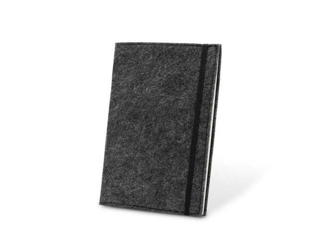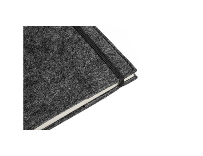 Capa em feltro 100% reciclado, com caderno A5 no interior. O caderno removível contém a capa em papel 100% reciclado, bem como 160 páginas pautadas (70 g/m²) também em papel 100% reciclado.