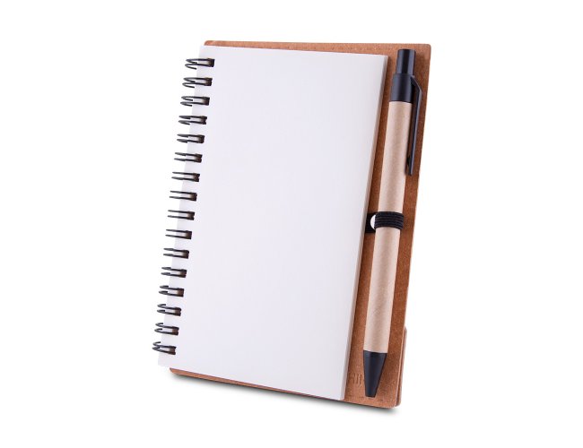 Kit composto por caderno com capa em papelão, com miolo de 70 folhas sem pauta em papel 70g/m². Acompanha caneta confeccionada em papelão reciclado com detalhes em plástico. com sticky notes para anotações.