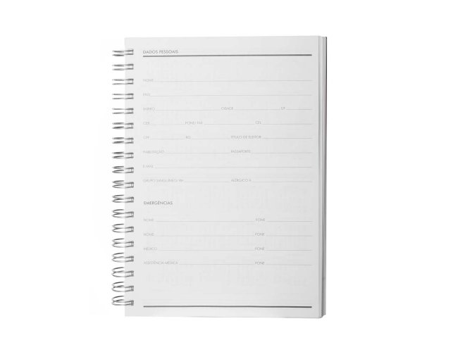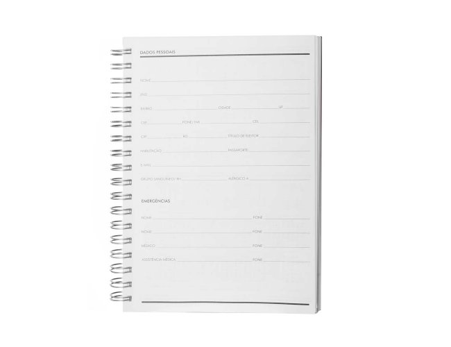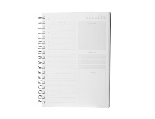 Caderno planner com capa rígida em PU de 2mm em formato espiral. Contém 90 folhas brancas de 95g/m². Folhas estruturadas em formato de planner para anotações e gestão da rotina.
