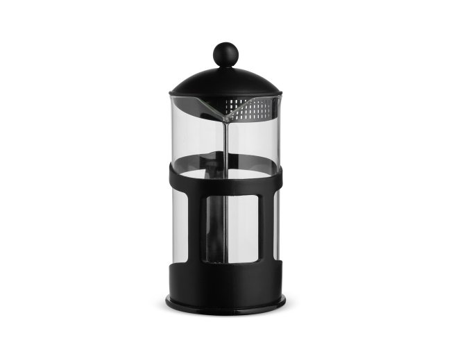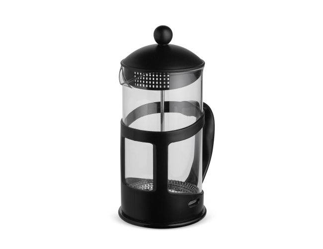 Cafeteira tipo prensa francesa em vidro com capacidade para até 1 litro, além de alça e detalhes em plástico. Possui tampa em plástico com êmbolo e tela em inox.