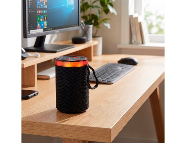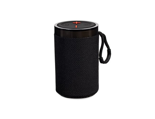 Caixa de som multimídia em plástico ABS, revestimento em malha de poliéster, painel de botões em silicone, iluminação RGB ajustável, alça em nylon com proteção emborrachada e base antiderrapante. Apresenta conexão Bluetooth 5.3, rádio FM e tecnologia TWS, que permite sincronizar duas caixas simultaneamente. Conta ainda com entradas USB-A e TF para reprodução de arquivos MP3 via pen drives e cartões microSD, além de conexão USB-C para recarga. Acompanha cabo USB-C.