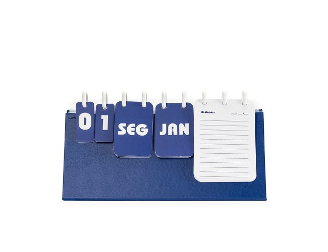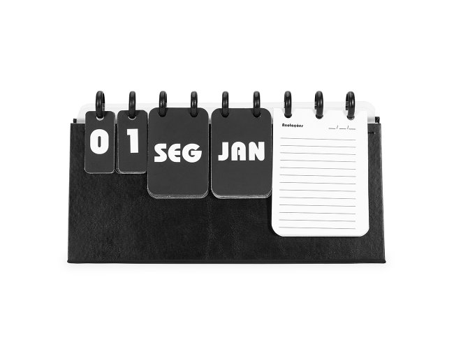 Calendário permanente de mesa com base em percalux e encadernação em discos plásticos reposicionáveis. Inclui fichas para marcação dos dias do mês em números, do dia da semana em texto e do mês também em texto, além de um bloco de anotações com cerca de 30 folhas brancas pautadas.