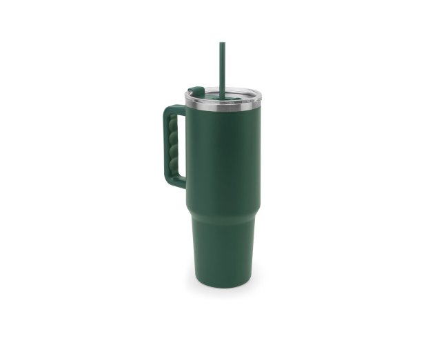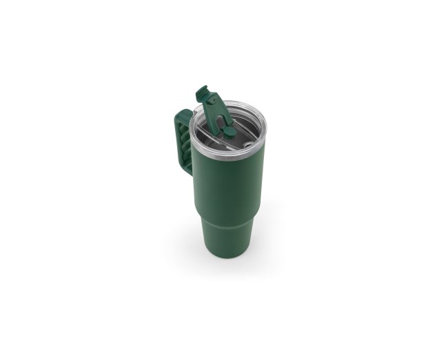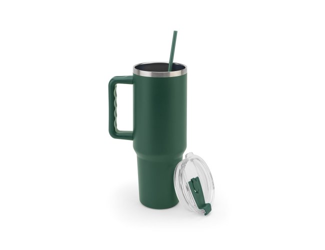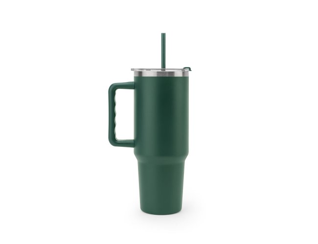 Copo de viagem de grande dimensão para se manter hidratado durante o dia sem a necessidade de recargas constantes. Composto por aço inox 91% reciclado, com parede dupla isolada a vácuo e acabamento em mate. Este copo pode ser utilizado de duas maneiras: através da sua abertura para canudo ou do orifício para utilização direta (pode ser fechado). A sua pega facilita o transporte quer seja para o trabalho ou para atividades ao ar livre. Capacidade até 1300 mL. Fornecido em caixa presente de papel kraft reciclado. Certificação EU Food Grade.