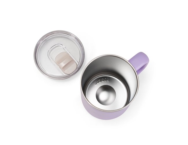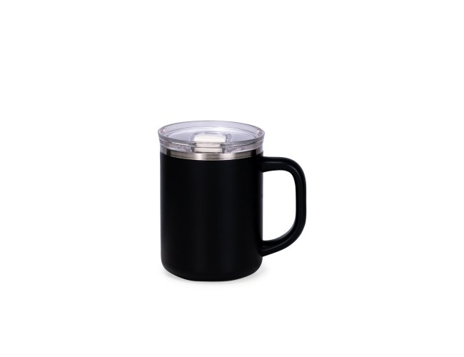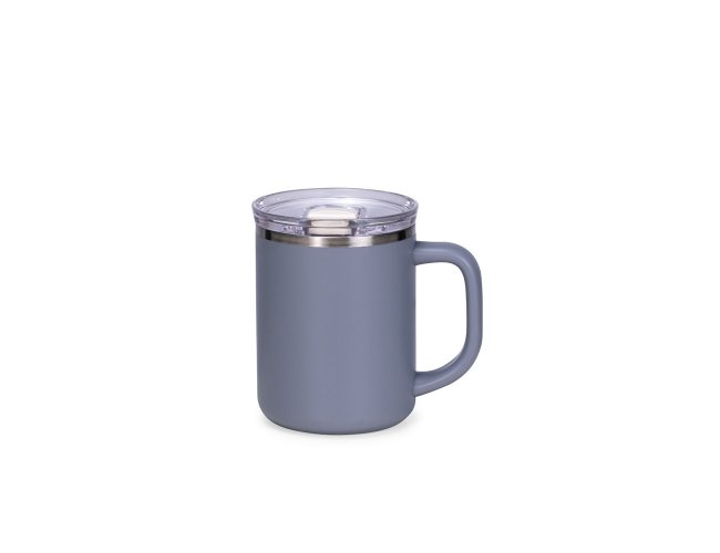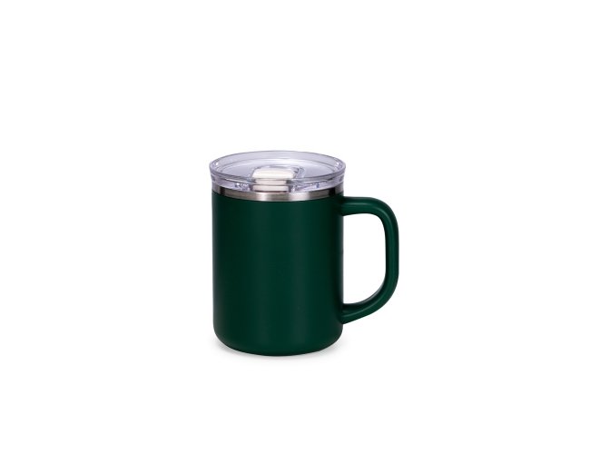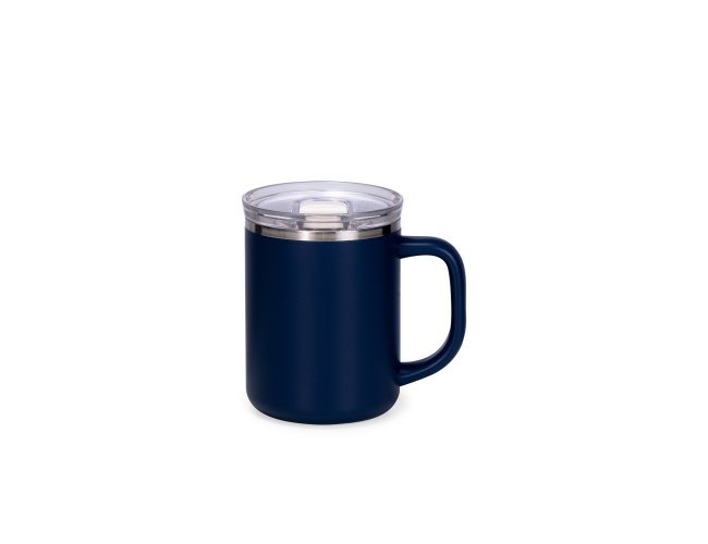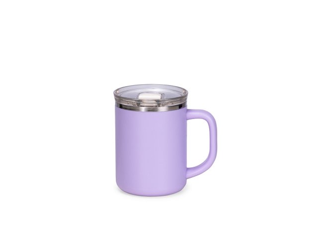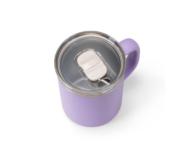 Caneca de parede dupla, com interior em inox 304 e revestimento externo e alça em plástico polipropileno (PP). Com capacidade máxima de 450ml, possui tampa de pressão em AS com protetor deslizante para o bocal em PP.