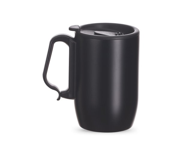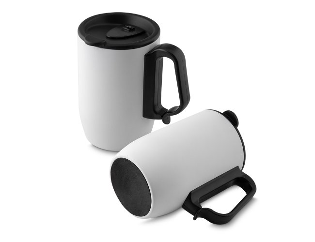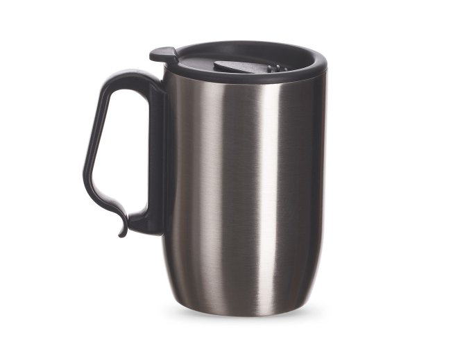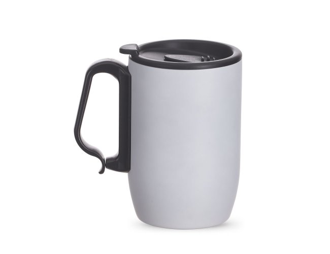 Caneca Térmica em aço inox de 350ml, alça de mão plástica tipo mosquetão, tampa com vedação e base de apoio em EVA.