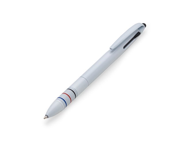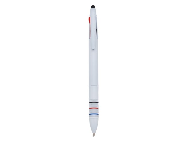 Caneta plástica três cores e ponteira touch, corpo branco com detalhes coloridos. Possui as cargas azul, preto e vermelho(basta descer o suporte colorido pra acionar a cor). Clip plástico e touch superior, possui anéis preto, vermelho e azul na parte inferior em relevo. Tam. 14,9 x 1,4 cm.