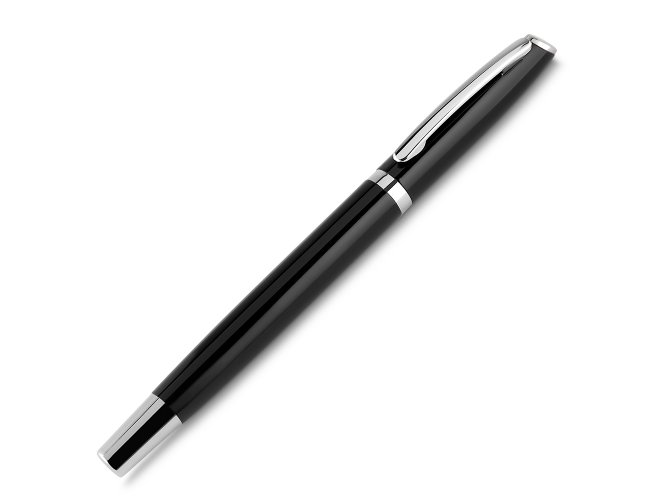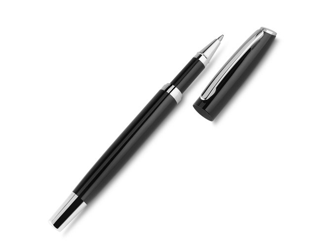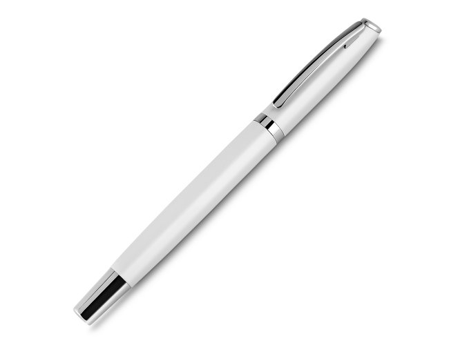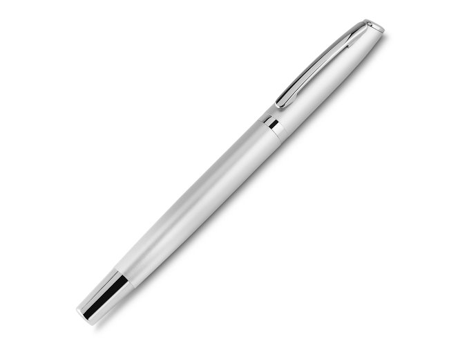 Caneta metal roller de Alumínio escrita em azul.