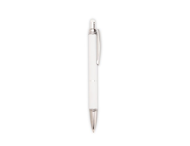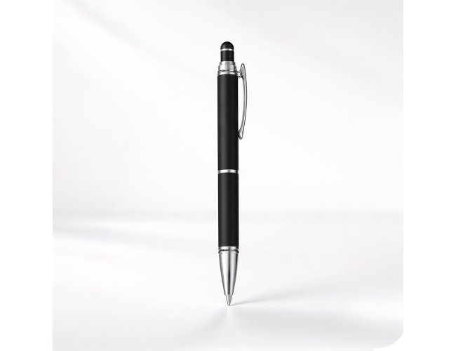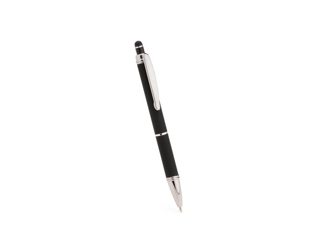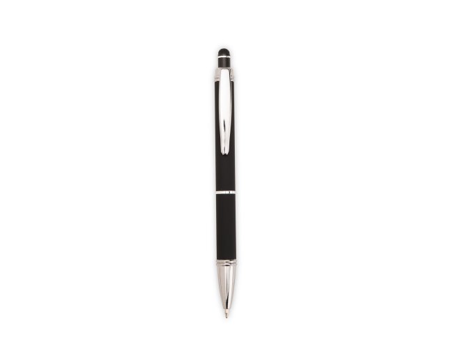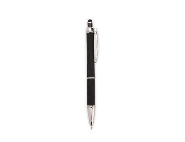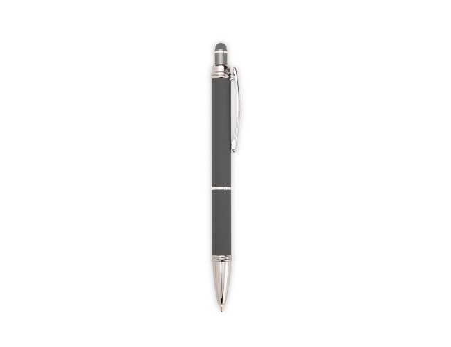 Caneta metálica com pintura de acabamento emborrachado. Possui acionamento por clique, topo emborrachado para uso em dispositivos com telas sensíveis ao toque e carga esferográfica azul de 1,0 mm.