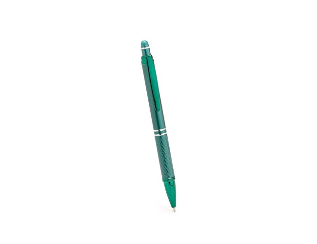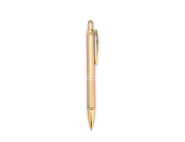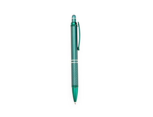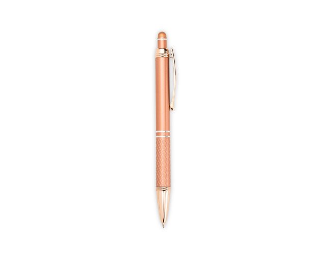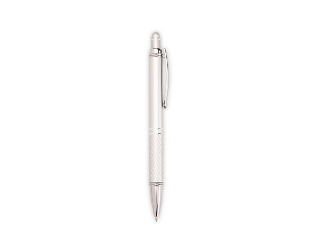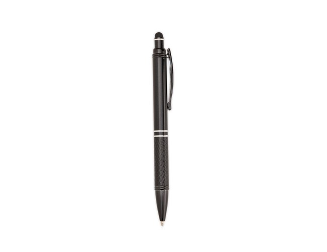 Caneta metálica com ponta e clip em plástico. Possui detalhe emborrachado no topo para interação com dispositivos de telas sensíveis ao toque. Conta ainda com acionamento por clique e carga esferográfica azul de 1,0mm.