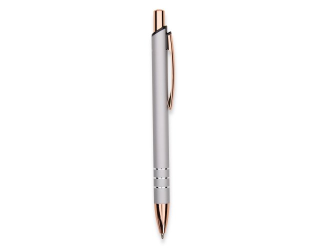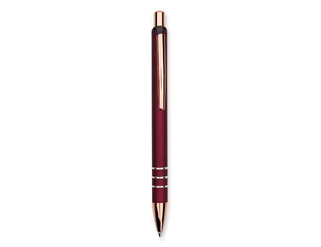 Caneta metálica com acionamento por clique e carga esferográfica azul de 1,0mm, oferecendo uma pegada leve para uma escrita mais precisa.
