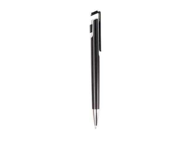 Caneta plástica com ponta metálica, acionamento por clique e abertura que funciona como suporte de celular. Possui ponteira com revestimento em feltro para limpeza de telas e carga esferográfica azul de 1.0mm.