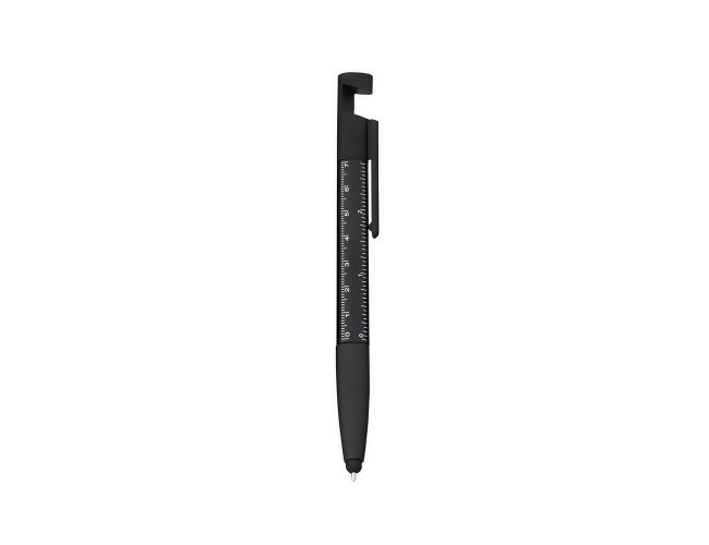 Caneta plástica triangular com ponteira emborrachada para interação em dispositivos de telas sensíveis ao toque. Possui clip com revestimento em feltro no topo, ideal para limpeza de tela, além de abertura que funciona como suporte para celular. Conta ainda com marcação de régua de 7 cm no corpo, acionamento por rotação e carga esferográfica azul de 1,0mm.