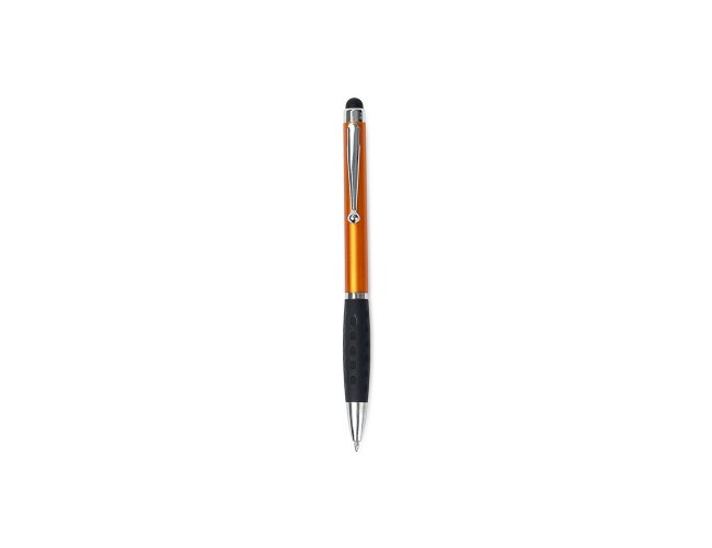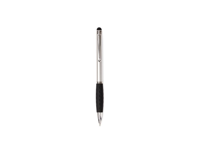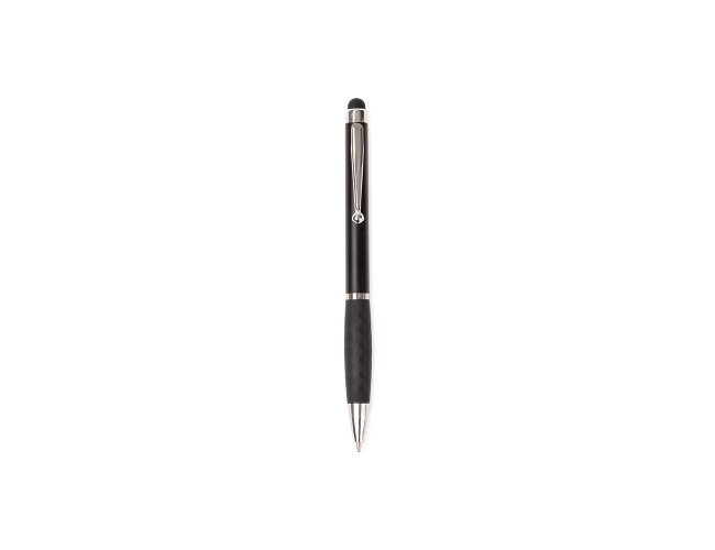 Caneta plástica com clip e pequenos detalhes em metal, além de detalhes ergonômicos na área próxima à tampa. Possui acionamento por rotação, carga esferográfica azul de 1.0mm e ponteira emborrachada para interação com dispositivos de telas sensíveis ao toque.