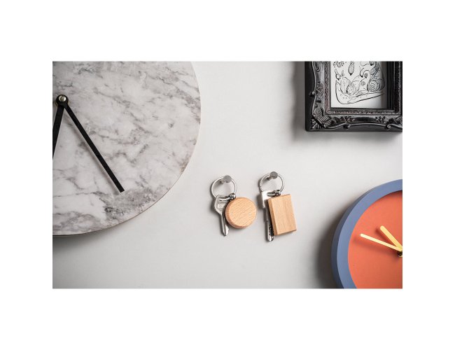 Chaveiro em formato retangular em madeira de faia, resistente e elegante, com argola de ferro. A cor e o resultado da impressão nos materiais naturais pode variar entre produtos.