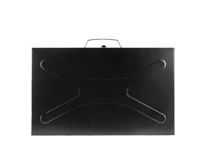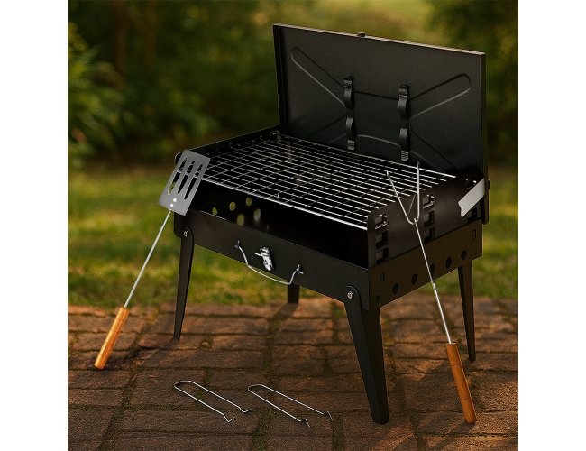 Churrasqueira feita em metal com funcionamento a carvão. Possui formato compacto e pode ser transportada como uma maleta quando desmontada, além de alça para transporte, trava de segurança para fechamento e quatro pés retráteis. Acompanha uma espátula e espeto duplo com cabo em madeira.