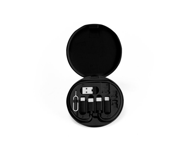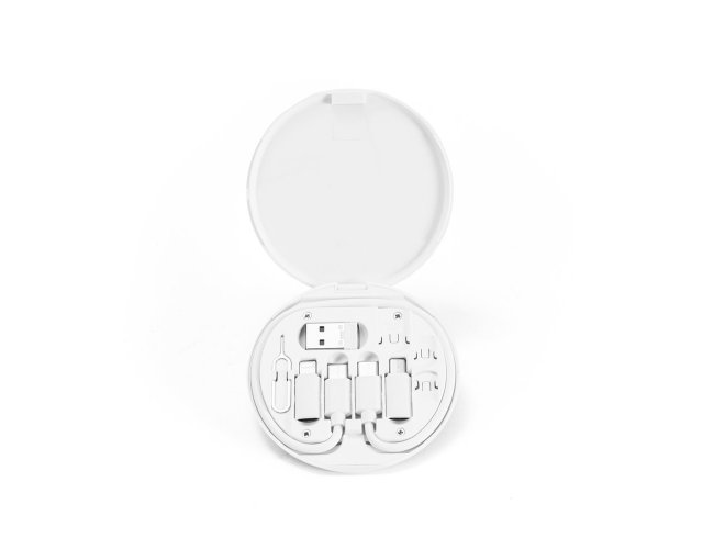 Conjunto composto por cabo e adaptadores de carregamento super-rápido em ABS 100% reciclado. Incluso um cabo USB-C para USB-C com 28,5 cm que suporta carregamento super-rápido até 60W e transferência de dados, um adaptador USB-C/USB-A, um USB-C/Micro USB e um USB-C/Lightning. Incluso ainda uma peça de remoção de cartões SIM e 3 slots para guardar cartões SIM Nano e Micro SIM. Fornecido em caixa presente de papel kraft reciclado.