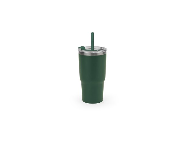 Copo de viagem compacto e de fácil utilização para as suas viagens e atividades ao ar livre. Composto por aço inox 91% reciclado, com parede dupla isolada a vácuo e acabamento mate. Este copo pode ser utilizado de duas maneiras: através da sua abertura para palhinha ou do orifício para utilização direta (pode ser fechado). Capacidade até 600 ml. Fornecido em caixa presente de papel kraft reciclado. Certificação EU Food Grade.