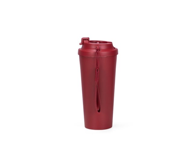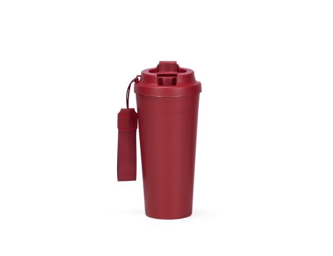 Copo em inox 304 com revestimento externo em polipropileno (PP) e capacidade para até 480ml. Apresenta tampa rosqueável em PP livre de BPA com protetor para o bocal. Acompanha alça em nylon com detalhe em couro sintético para transporte.