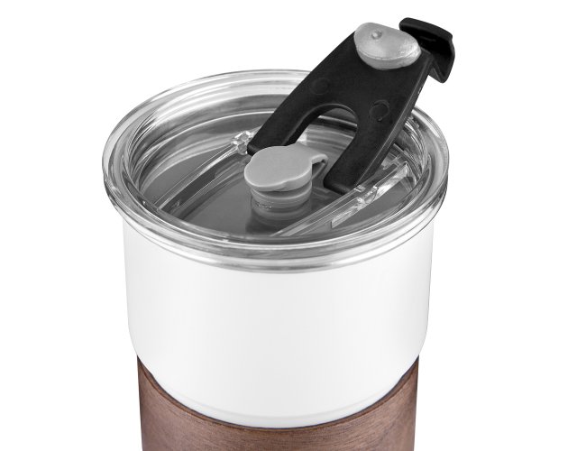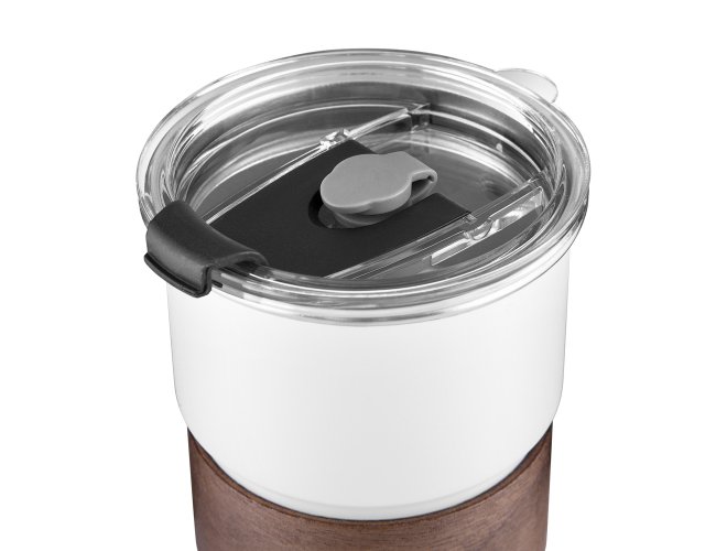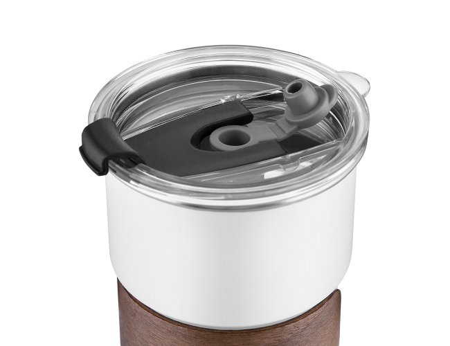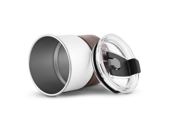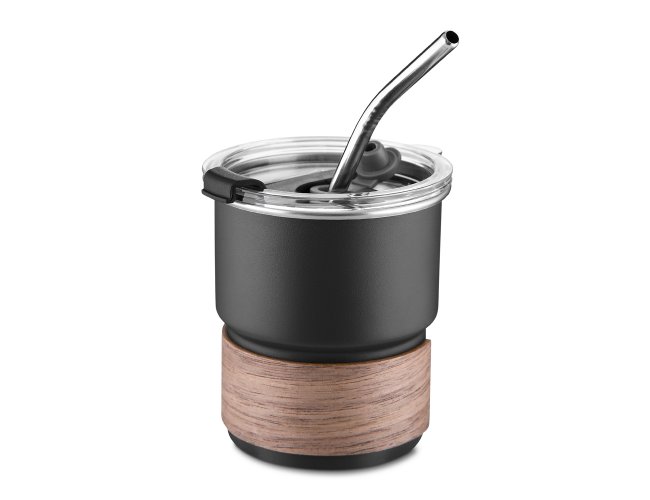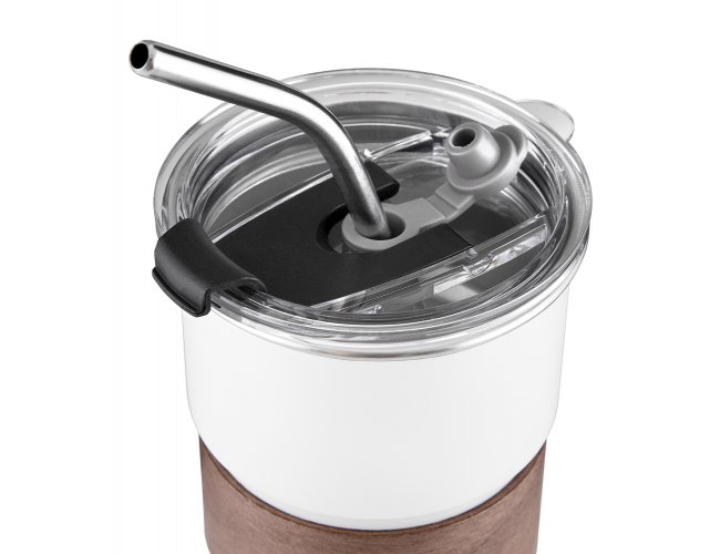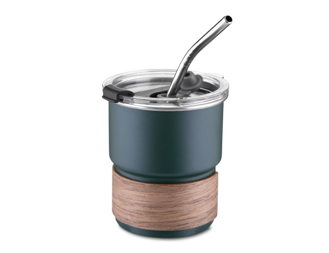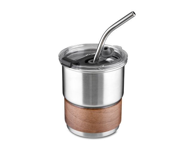 Copo de parede simples em aço inox 304 com capacidade de 250ml, com canudo em inox. Tampa em plástico poliestireno (PS) que também possui um bico como forma alternativa de uso. Com pegador em fibra de noz. Possui acabamento externo com pintura fosca.