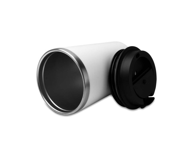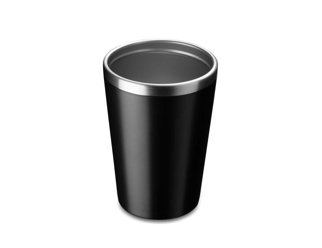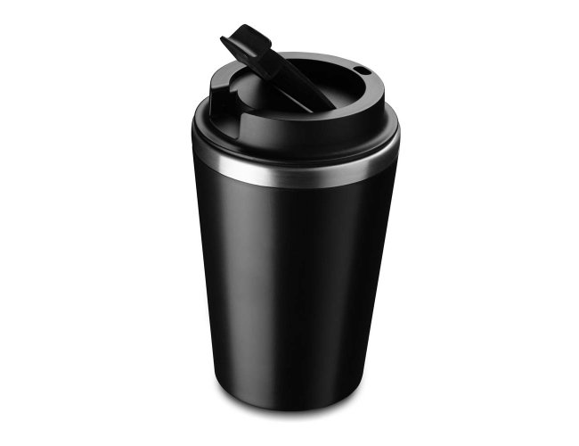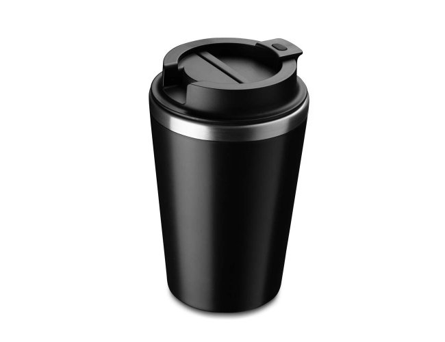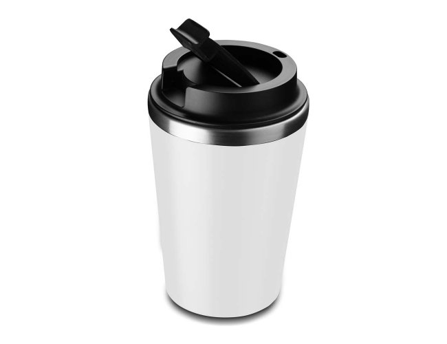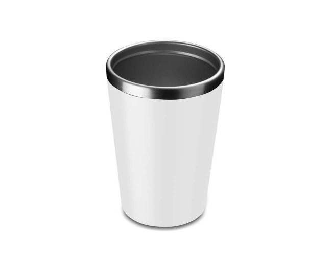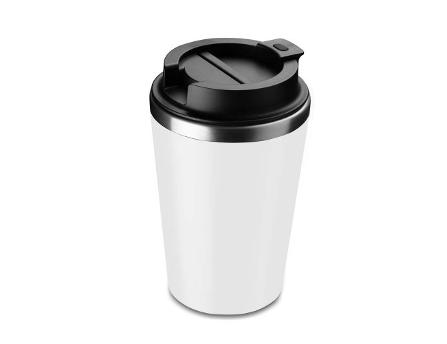 Copo de 350 ml com parede dupla, interior em inox 304 e exterior em plástico PP, tampa em plástico PP e acabamento com pintura fosca.