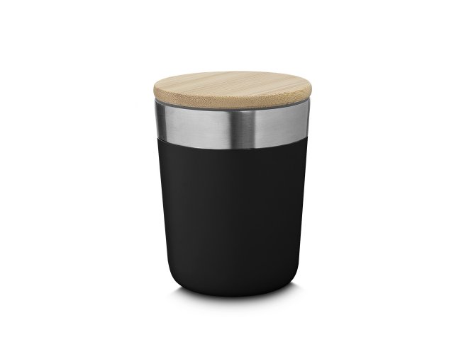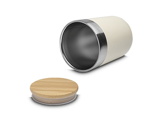 Copo térmico em aço inox, pintura fosca, detalhe em aço inox, tampa em bambu com anel de silicone para vedação, capacidade de 300ml.