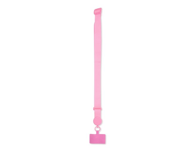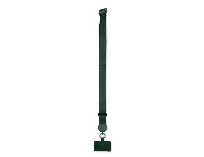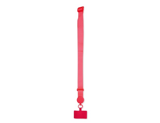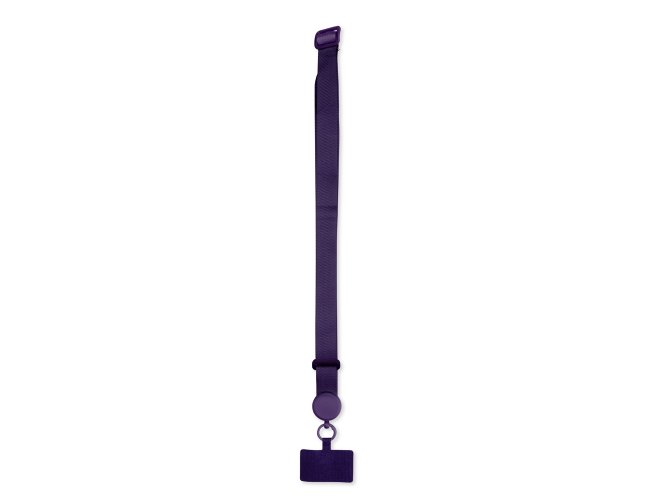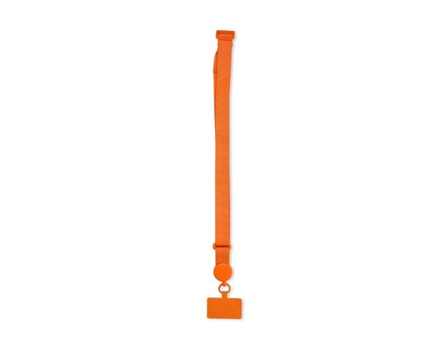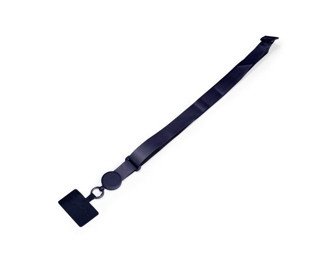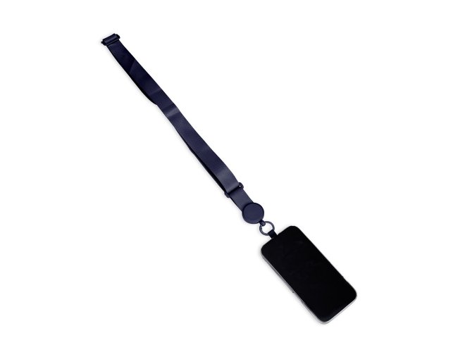 Cordão com alça ajustável para celular feito em poliéster. O acessório é fixado a um cartão retangular que se encaixa na parte interna da capa do celular, próximo à entrada de carregamento USB.