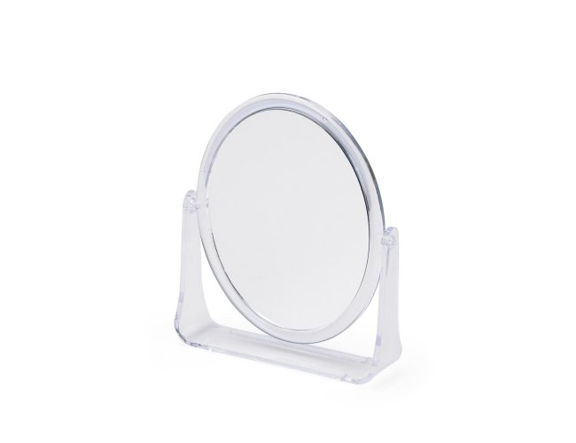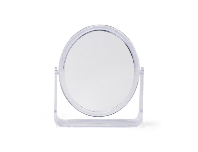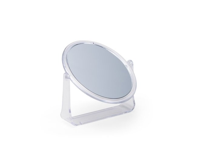 Espelho de mesa oval giratório com face dupla sem aumento e estrutura em plástico polipropileno (PP) transparente.