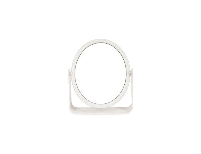 Espelho de mesa oval dupla face, sem aumento, com moldura e base em plástico polipropileno (PP).