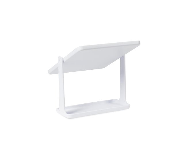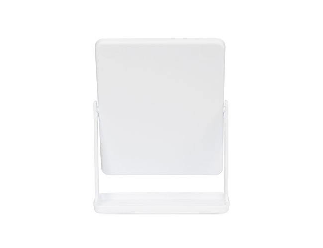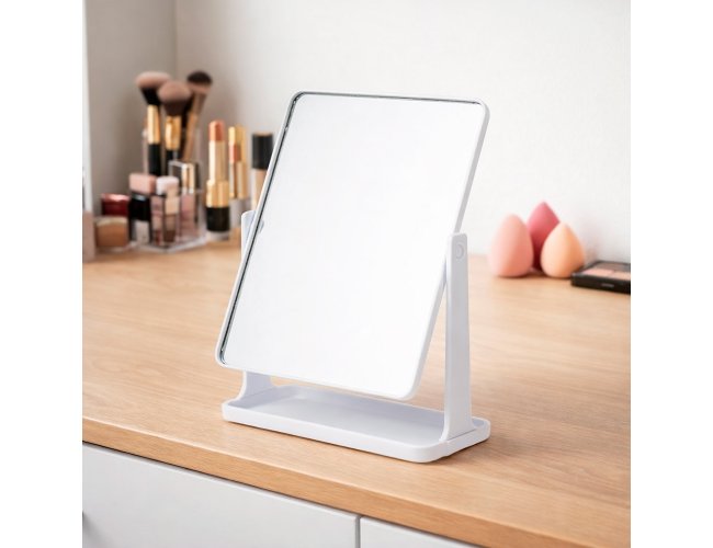 Espelho de mesa giratório retangular sem aumento. Possui estrutura em plástico e base com espaço para organizar pequenos objetos.