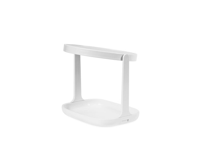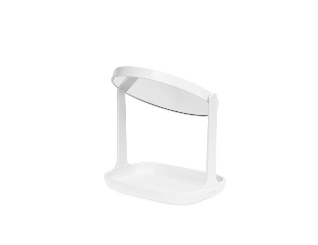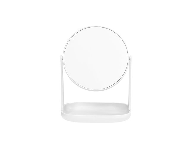 Espelho de mesa giratório dupla face sem aumento e estrutura feita em plástico. Possui base com espaço para organizar objetos pequenos.