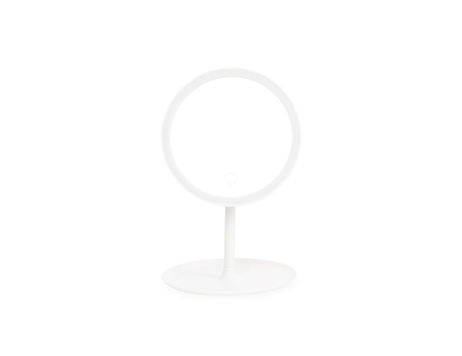 Espelho de mesa com estrutura montável em plástico, movimentação vertical de até 90 graus, iluminação em LED com três níveis de ajuste e entrada USB-C para recarga. Acompanha cabo USB-C.