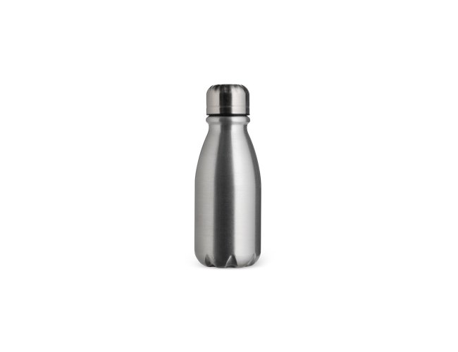 Garrafa em alumínio com tampa rosqueável e capacidade máxima de 400ml.