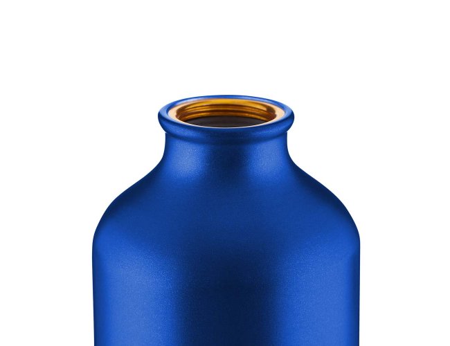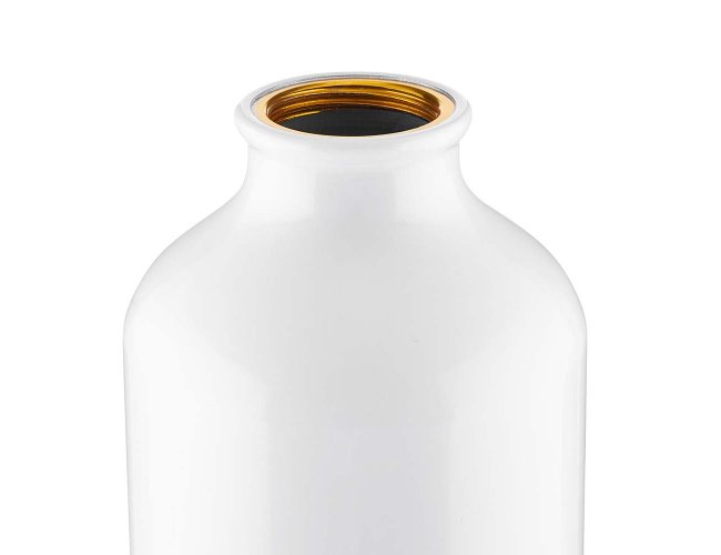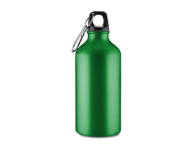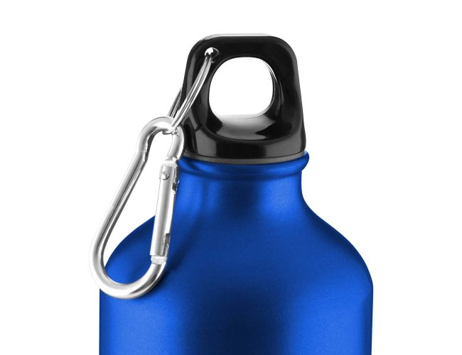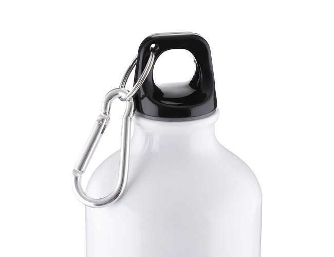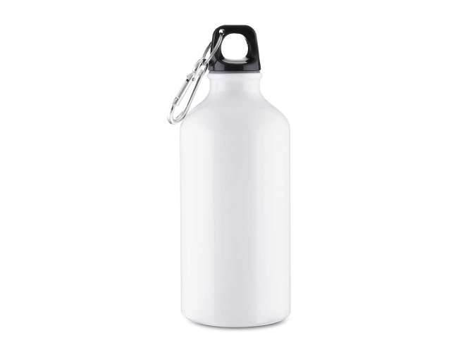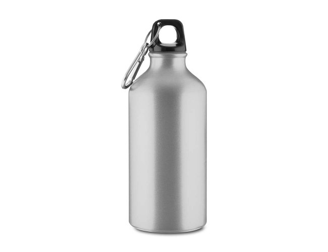 Garrafa em alumínio com capacidade para até 550ml com acabamento mate. Possui tampa rosqueável em plástico e mosquetão metálico acoplado à tampa para transporte.