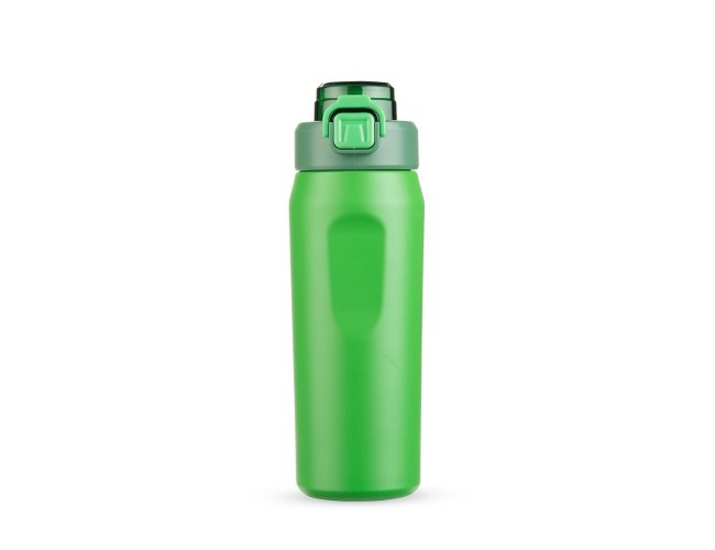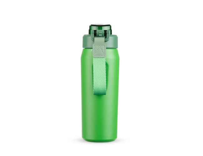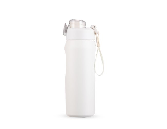 Garrafa térmica em inox SUS 304. Conta com estrutura de parede dupla e vedação a vácuo, ajudando a conservar a temperatura dos líquidos por mais tempo. Possui sistema de canudo com acionamento e dois modos de uso para beber, sendo um deles através da abertura principal e outro por meio do bico em plástico polipropileno (PP) integrado à tampa. Sua tampa é rosqueável em plástico, com protetor para o bocal e para o bico suporte do canudo, além de trava de segurança que impede a abertura do protetor. Conta com base antiderrapante para maior estabilidade, alça de PVC com fibra sintética e acompanha canudo de silicone para encaixe interno na tampa.