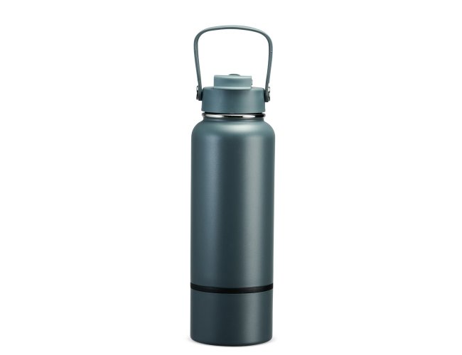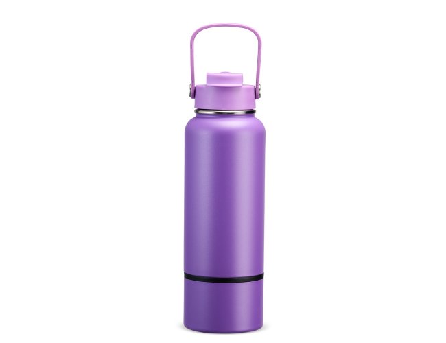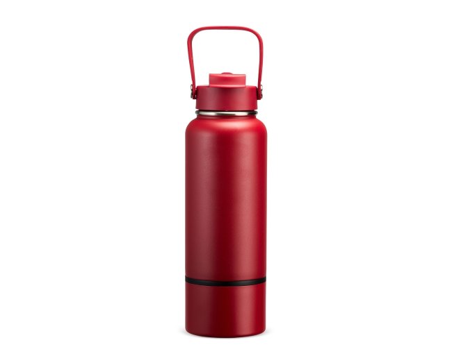 Garrafa térmica em inox com pintura eletrostática e capacidade de até 800ml. Apresenta estrutura interna de parede dupla e vedação a vácuo, o que ajuda a conservar a temperatura de líquidos por mais tempo. Conta ainda com fundo removível. Possui tampa plástica rosqueável com protetor para o bocal, bico flip, canudo interno removível e alça fixa para transporte.